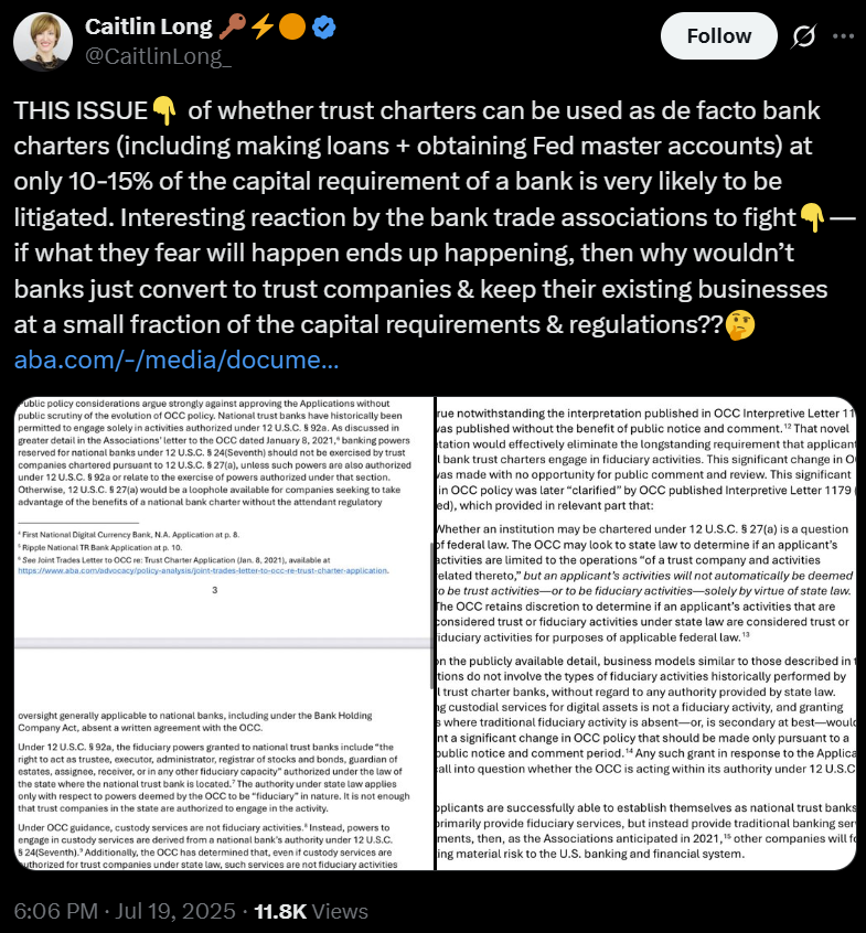 Лонг утверждал, что вопрос о том, могут ли трастовые уставы функционировать как де-факто банковские уставы, позволяющие учреждениям выдавать кредиты и получать генеральные счета Федеральной резервной системы, имея лишь часть капитала, необходимого для банков с полным спектром услуг, «весьма вероятно, будет предметом судебного разбирательства».