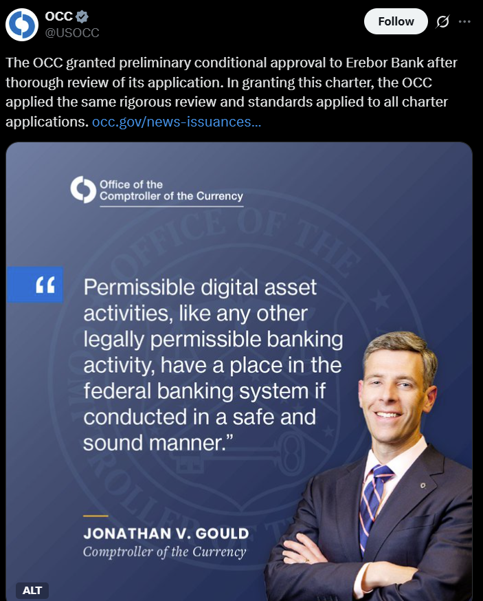 Одобрение было подтверждено Управлением контролера денежного обращения (OCC), при этом контролер Джонатан В. Гулд заявил, что «разрешенная деятельность с цифровыми активами […] имеет место в федеральной банковской системе, если осуществляется безопасным и надежным образом».