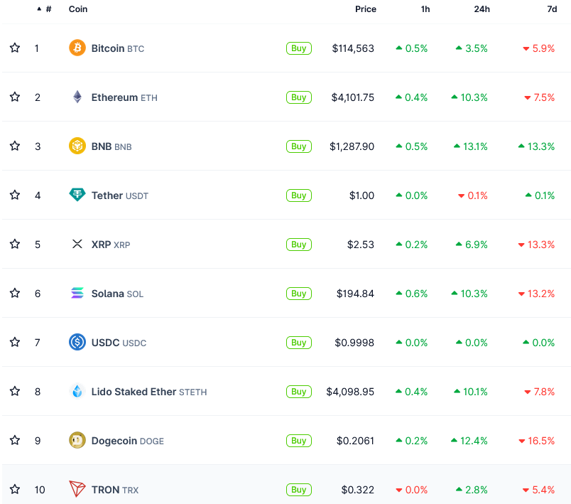 По данным CoinGecko, три монеты «голубых фишек» выросли на 10,5%, 13,6% и 12,5% за последний день, в то время как Solana (SOL), Cardano (ADA) и Chainlink (LINK) также выросли более чем на 10%.
