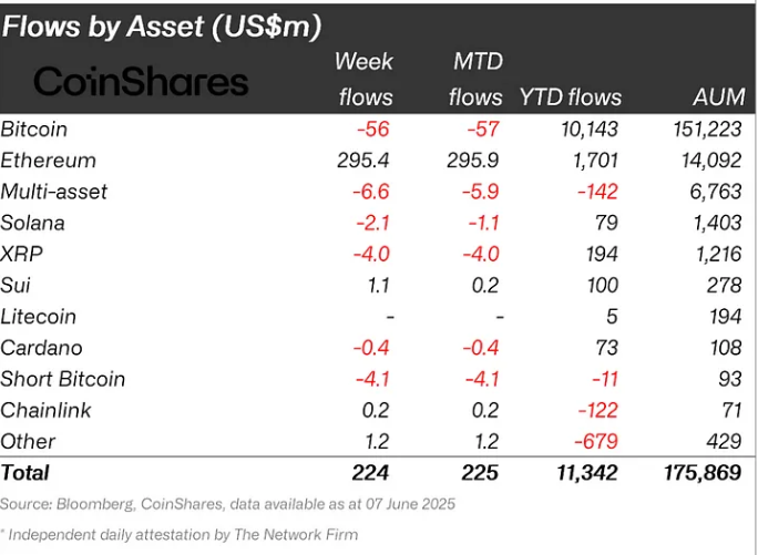 Во всех продуктах для инвестиций в цифровые активы еженедельные притоки достиг 286 миллионов долларов, что увеличило семинедельное общее количество до 11 миллиардов долларов. Тем не менее, фонды Биткоин (BTC) в виде оттоки стоили 56 миллионов долларов, вторая неделя подряд чистых убытков.