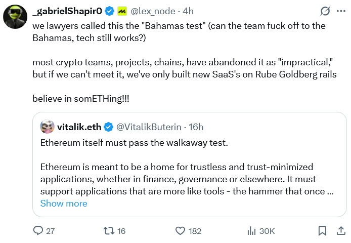 По словам его соучредителя Виталика Бутерина, Ethereum должен достичь точки, когда его ценностное предложение останется, даже если разработчики прекратят активную работу над протоколом.