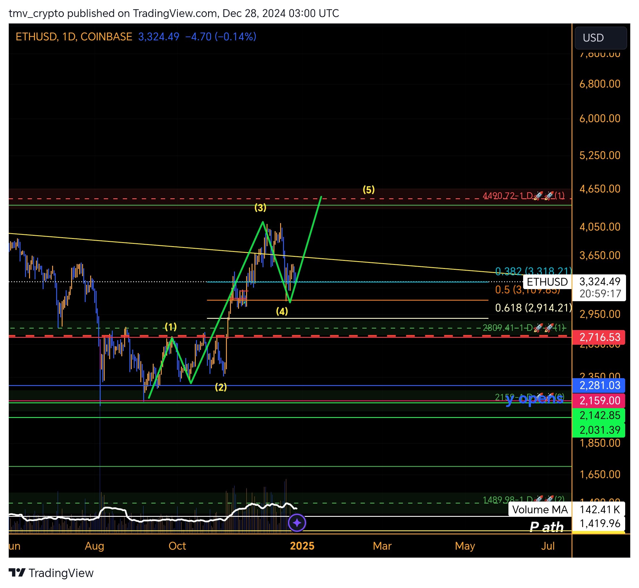 Судя по моделям технических графиков, Эфир вступил в волну накопления, которая может помочь цене ETH превысить 4400 долларов в первом квартале 2025 года, написал популярный криптовалютный аналитик TMV в сообщении X от 28 декабря: