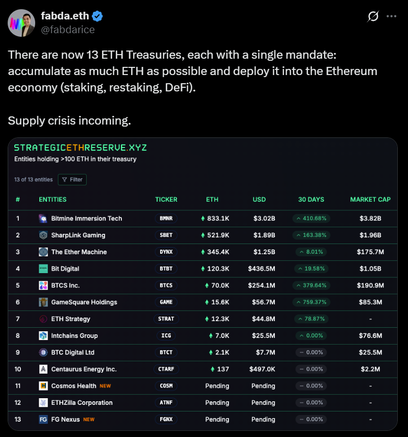 Кадан Стадельманн, директор по технологиям платформы Komodo, провел параллели между фирмами Eth-Creasury и выставленными фондами обмена (ETFS), отметив, что первый может предложить преимущества, которые не могут ETF. «Spot ETF не могут на законных основаниях предложить посадку и дефициту», – сказал он. «Казначейские фирмы Ethereum предлагают более высокую доходность».