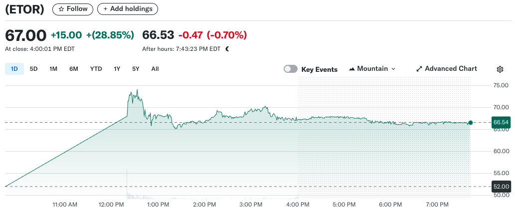 Акции в Etoro Group Ltd (Etor) закрылись 14 мая, торгуя на уровне 67 долларов, что на 28,9% по сравнению с его первоначальной ценой в размере 52 долл. США, согласно Yahoo Finance. Это приносит рыночную стоимость компании более 5,5 миллиардов долларов.