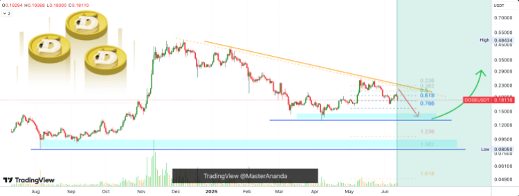 Он призвал к коррекции, используя минимум апреля 2025 года в качестве основы и более низкие максимумы, которые сформировались в результате. Это началось еще в декабре 2024 года, когда цена на Dogecoin начала повышать максимумы, что предполагает, что на рынке появилась медвежеспособность.