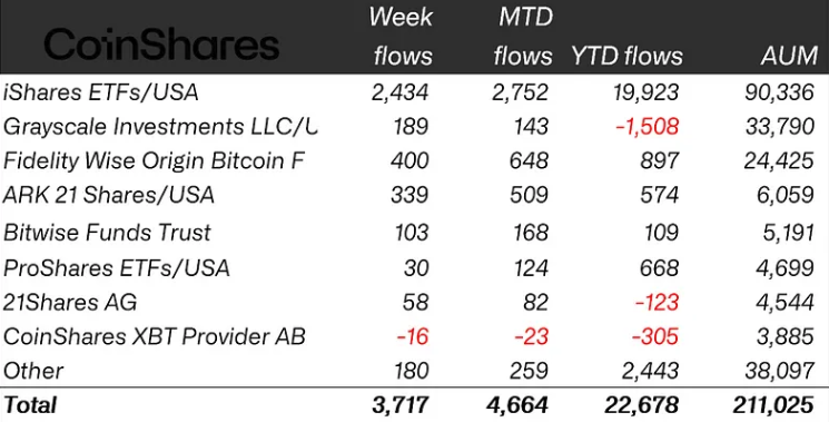 Глобальные продукты для обмена криптовалют (ETPS) зафиксировали приток в размере 3,7 млрд. Долл. США на торговую неделю, заканчиваемую в пятницу, сообщил Coinshares в понедельник.