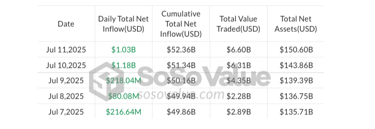 Тем не менее, настроения ETP только увеличились, поскольку ежедневные притоки в Биткоиных фондах (ETF) на следующий день выросли выше 1 миллиарда долларов, после того как BTC напечатал новые рекордные максимумы в прошлую среду в прошлую среду, согласно данным SoSovalue.