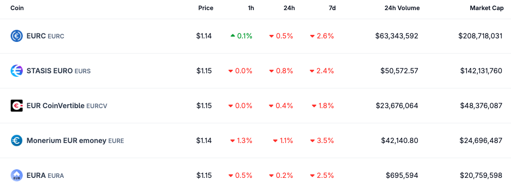По данным Coingecko, запуск Euros в Европе составил европейские консервации.