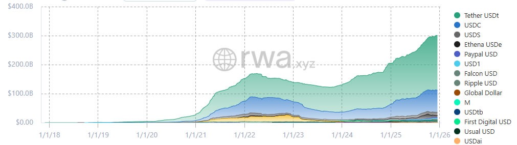 Tether (USDT) остается крупнейшим эмитентом стейблкоинов с долей рынка около 60% и оборотным предложением в 186 миллиардов долларов, в то время как USDC Circle занимает второе место с долей 25% и рыночной капитализацией в 78 миллиардов долларов.