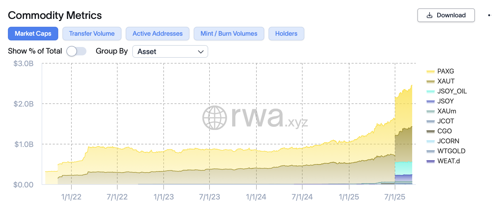 Согласно платформе токенизации RWA RWA.xyz, токенизация товаров представляет собой небольшую, но растущую часть рынка токенизации RWA.