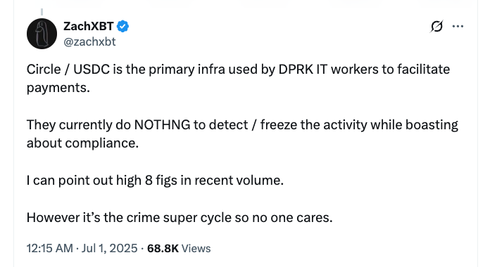 1 июля криптовалюта Sleuth Zachxbt отправилась в X, чтобы утверждать, что общественный круг эмитента StableCoin и его стаб -эмитент USDC (USDC) являются «основной инфраей, используемыми ИТ -работниками КНДР для содействия платежам».
