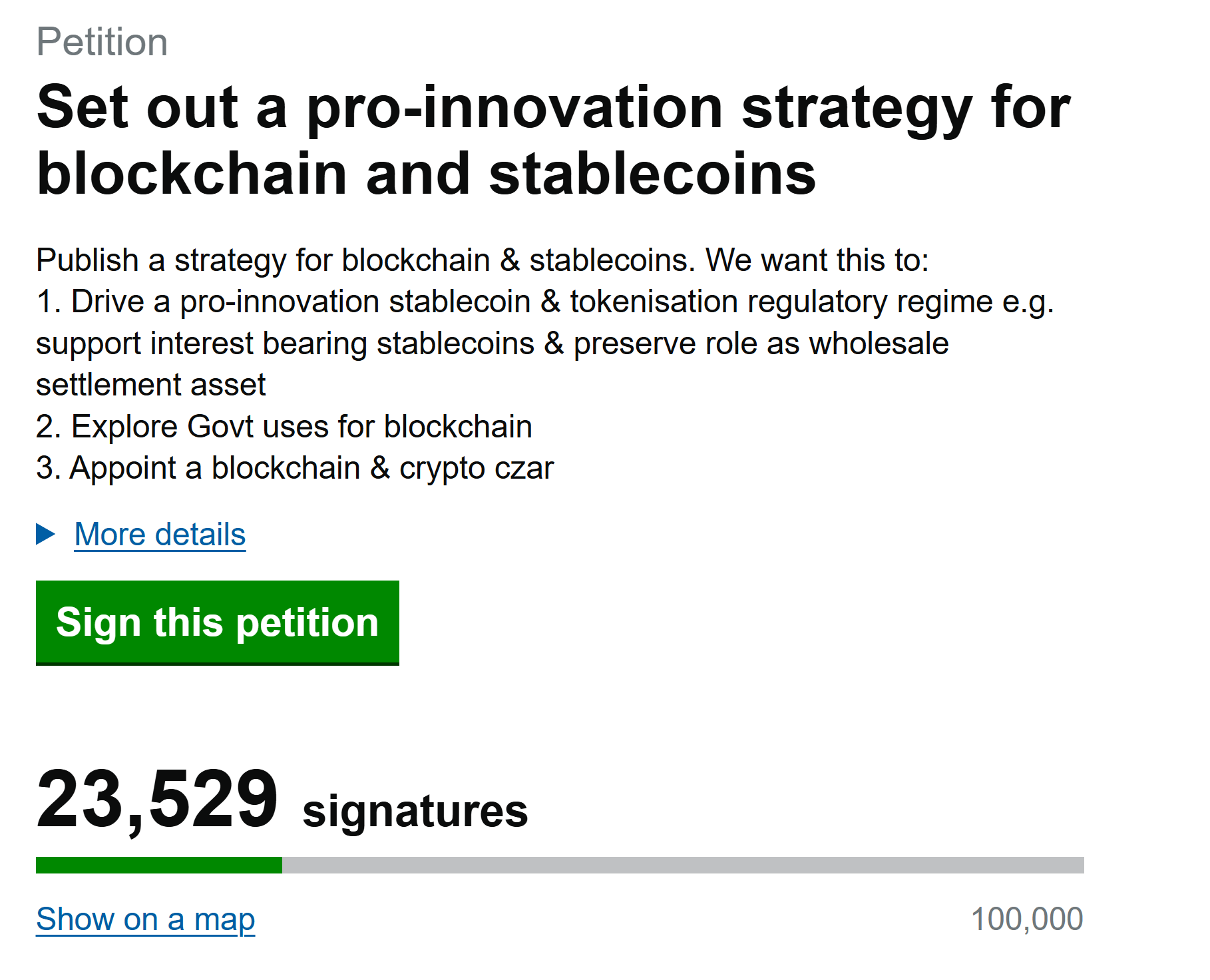 В прошлом месяце Coinbase попросила пользователей поддержать публичную петицию, призывающую Великобританию разработать инновационную стратегию для блокчейна и стейблкоинов. В петиции содержится призыв к созданию структуры, включающей регулирование стейблкоинов и токенизации, принятие блокчейна и назначение «царя» блокчейна.