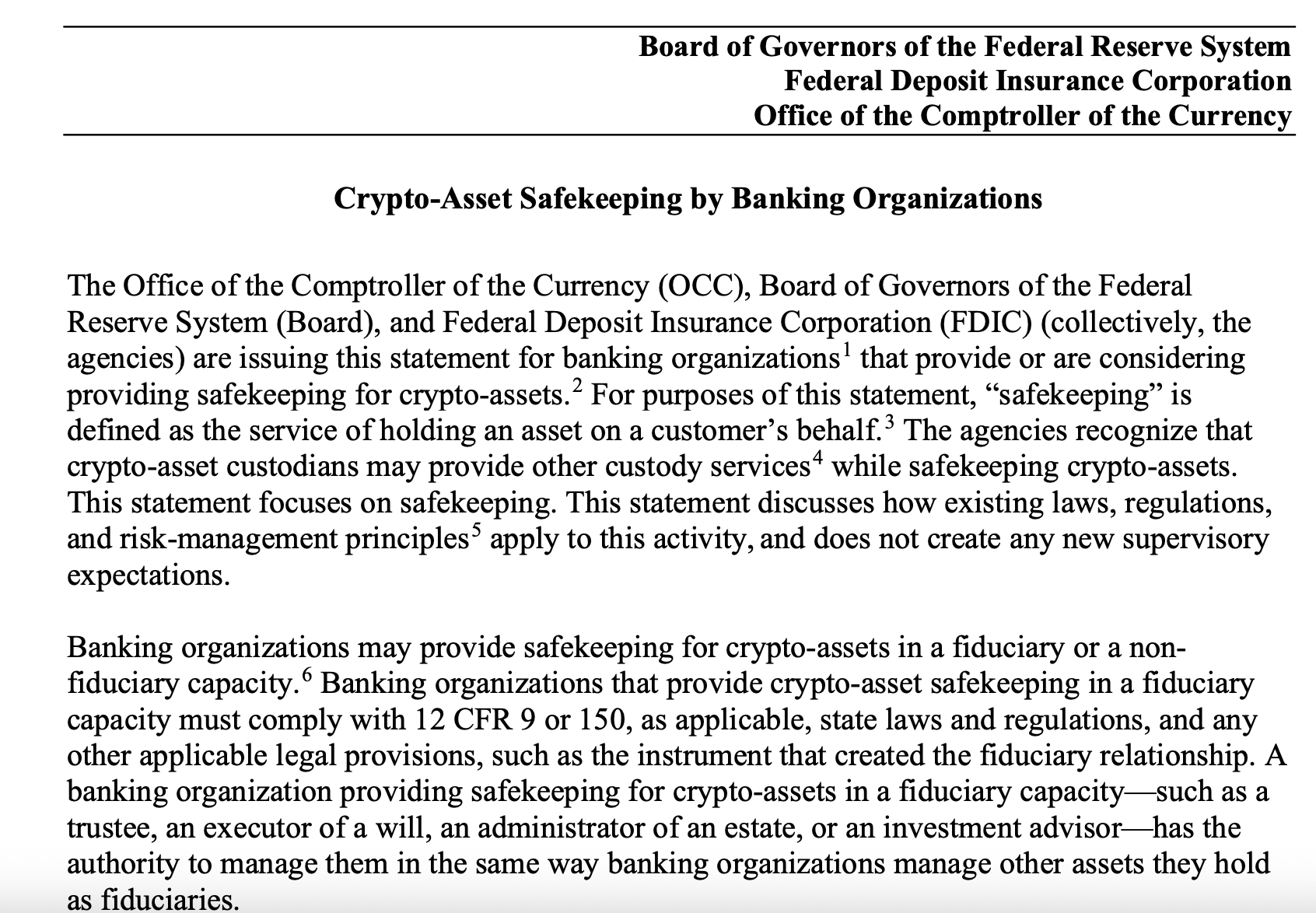 «Предоставление услуг с безопасным хранением крипто-ассет может повлечь за собой значительные ресурсы и внимание»,-говорится в нем. Три федеральных агентства, ответственные за документ, являются Федеральная корпорация страхования депозитов (FDIC), Управление контролера валюты (OCC) и Совет управляющих системы Федеральной резервной системы.
