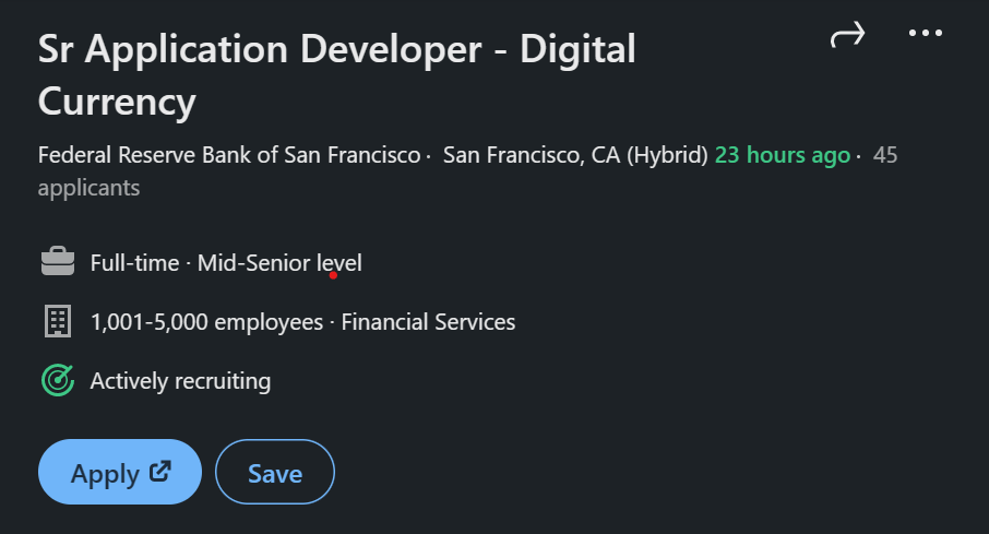 18 февраля SF Fed опубликовала вакансию «старшего разработчика приложений — цифровая валюта». Ожидается, что кандидат поможет Федеральной резервной системе в разработке и внедрении систем, имеющих решающее значение для исследований CBDC. Раскрывая свои намерения, пост SF Fed гласил: