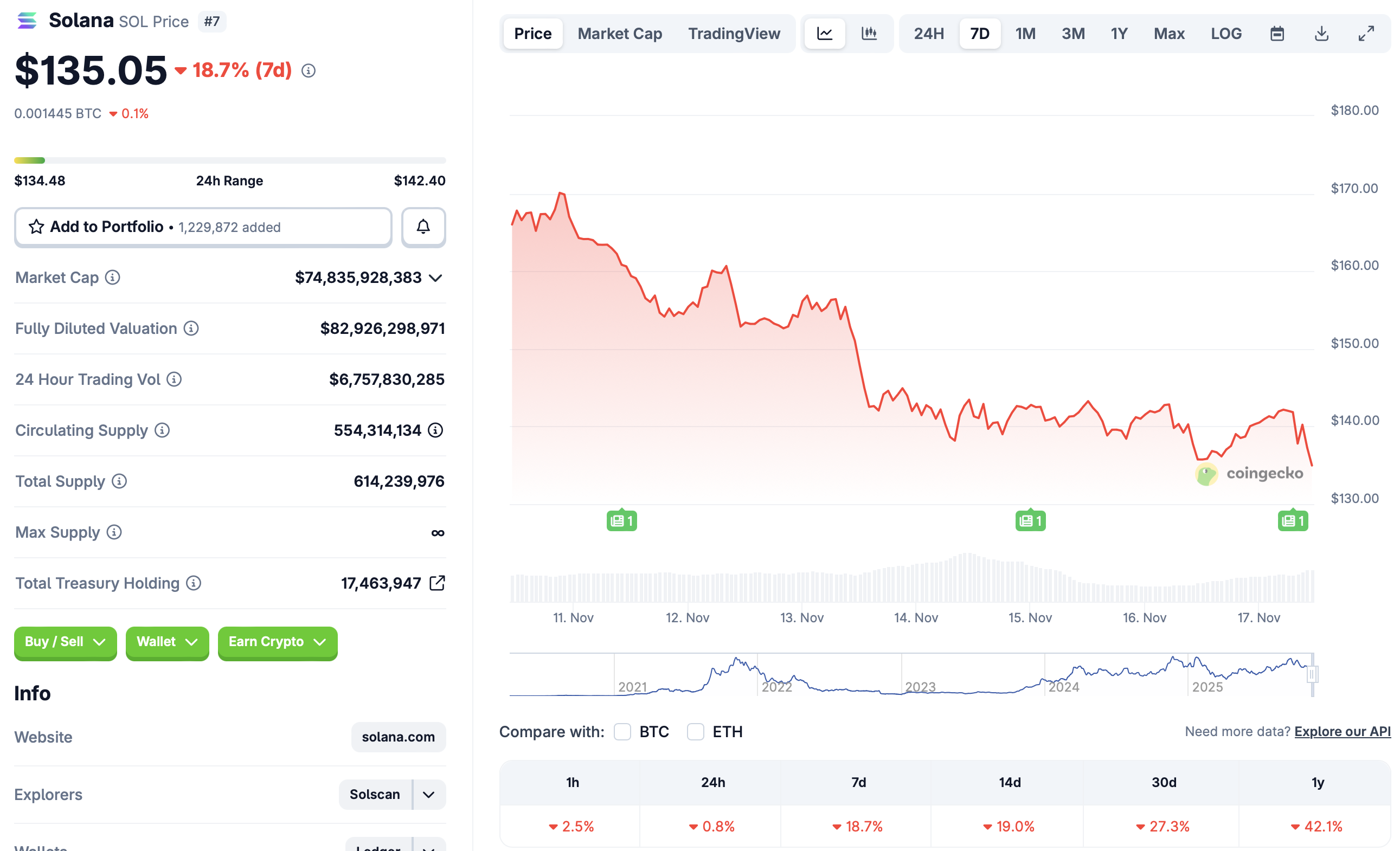 Несмотря на расширение регулируемого доступа к вознаграждениям за ставки Solana, цена SOL в последнее время находится в затруднительном положении. По данным CoinGecko, на момент написания SOL торговался по цене около 135 долларов за токен, что примерно на 19% меньше за последние две недели.