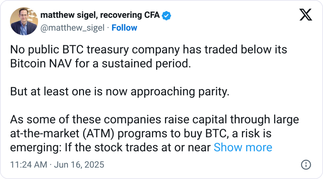 «По мере того, как некоторые из этих компаний приводят в пользу капитала через крупные программы на рынке (ATM) для покупки BTC, возникает риск: если акции торгуются в или около NAV [чистая стоимость активов], продолжающаяся выпуск акций может разбавить, а не создавать ценность»,-сказал глава Vaneck по исследованию цифровых активов, Мэтью Сигел в понедельник.