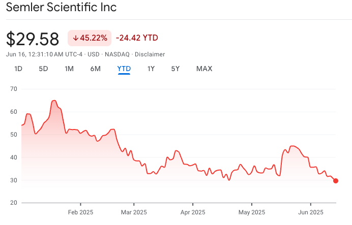 Semler – это медицинская технологическая фирма, которая впервые приобрела биткоин в мае 2024 года и увеличила свои активы до 13 -го по величине среди публичных фирм, 3808 BTC на сумму 404,6 млн. Долл. США.