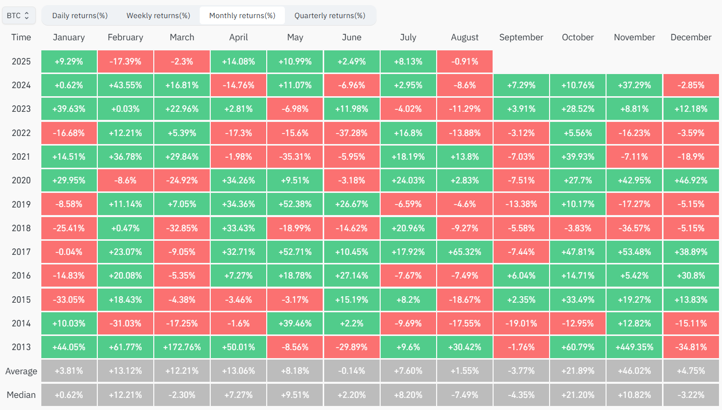 Снижение настроений происходит, когда биткоин (BTC) входит в август, исторически один из его худших месяцев. Данные из Coinglass показывают средний доход Биткоина в августе составляет -7,49%.