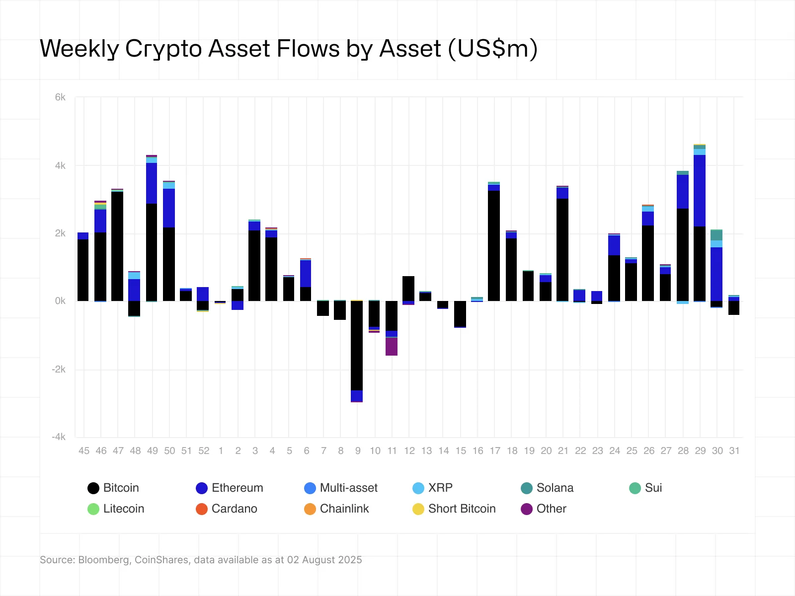 Фонды криптовалюты, ориентированные на XRP (XRP), Solana (SOL) и SUI (SUI), также закрыли неделю в зеленом, видя 31,2 млн. Долл. США, 8,8 млн. Долл. США и 5,8 млн. Долл. США в виде притоков соответственно.