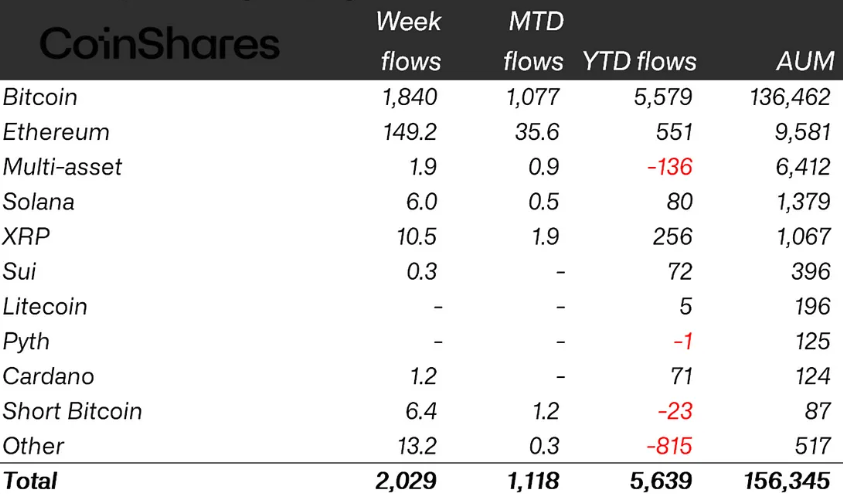 По данным европейской инвестиционной фирмы Coinshares, инвестиционные продукты криптовалюты привлекли 2 миллиарда долларов на новый приток на прошлой неделе.