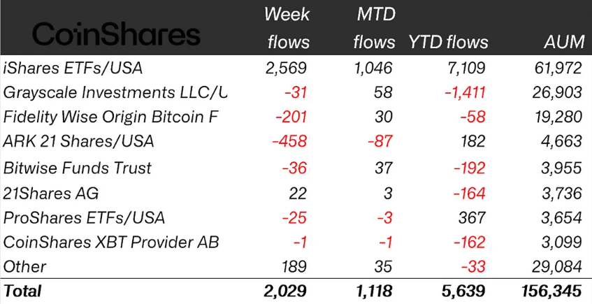 Согласно данным Coinshares, приток криптовалюты ETP был высоко сконцентрирован с продуктами BlackRock’s Ishares, которые на прошлой неделе составляли 2,7 миллиарда долларов.