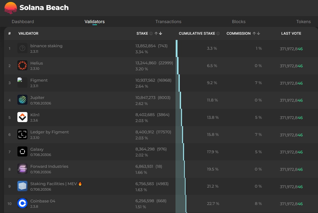 По данным Solana Beach, крупнейшими валидаторами Solana являются биканс, Helius, Figment и Jupiter.