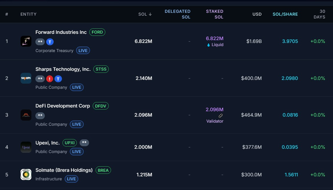 В настоящее время Forward Industries имеет крупнейшую казначейство криптовалюты в Солане, оцениваемое более 1,6 миллиарда долларов. Компания подкреплена криптовалютными гигантами Galaxy Digital, Jump Cryptocurrency и Multicoin Capital и планирует больше участвовать в экосистеме сети.