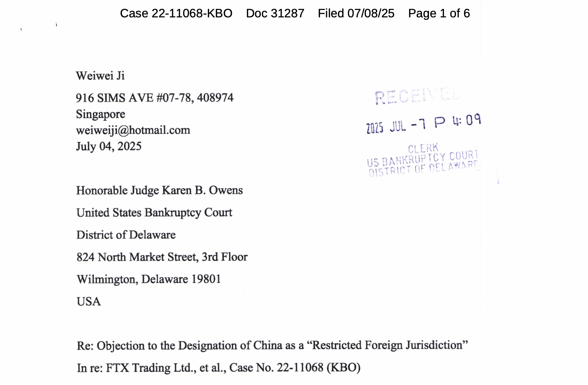 Китайский кредитор подал возражение против ходатайства от имущества FTX, которое приостановило бы выплаты жителям в юрисдикциях с законами или нормативными актами, ограничивающими операции с криптовалютой, согласно заявлению суда во вторник. Кредитор, Вейвей Джи, заявил, что, хотя они проживают в Сингапуре, они были классифицированы как китайский кредитор из -за проведения китайского паспорта. Джи отметил, что возражение было представлено от имени JI и растущей группы китайских кредиторов – по сообщениям, более 300 человек, согласно заявлению.