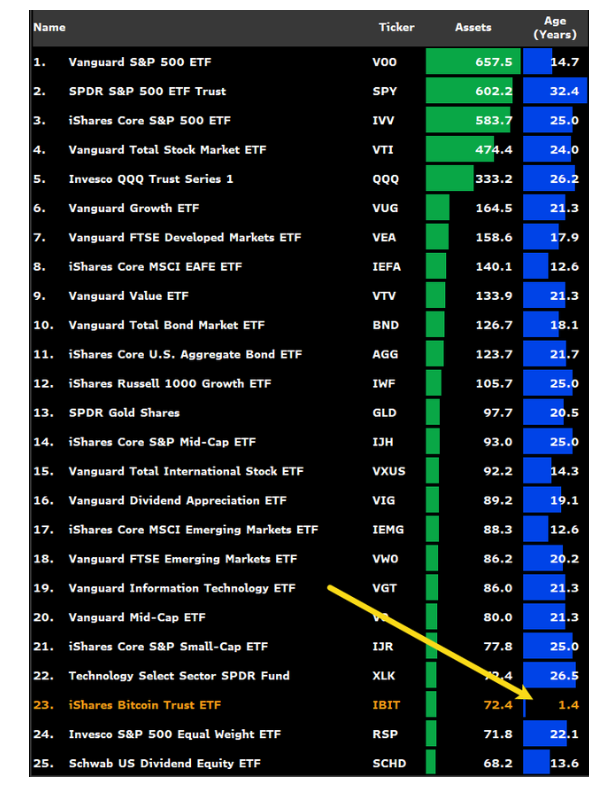 «В 1,4 года IBIT – самый молодой в списке на девять раз», – написал эксперт Bloomberg ETF в Bloomberg Balchunas во вторник.