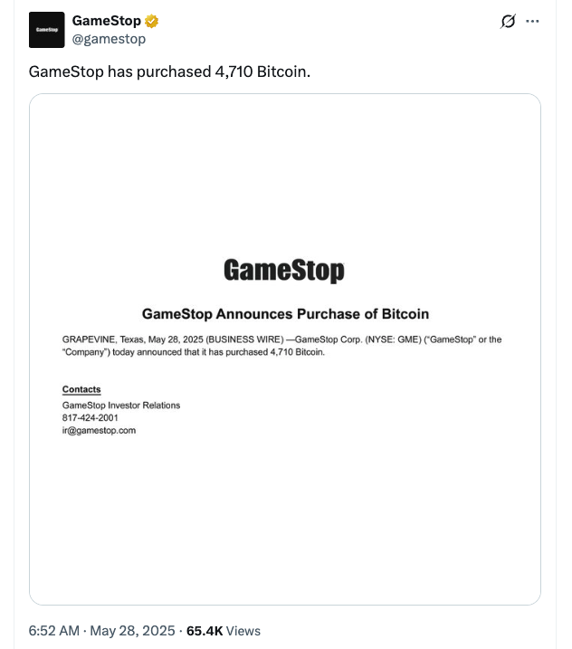 Gamestop приобрела 4710 биткоин (BTC), сообщила в своем коротком официальном заявлении на X, опубликованном 28 мая.