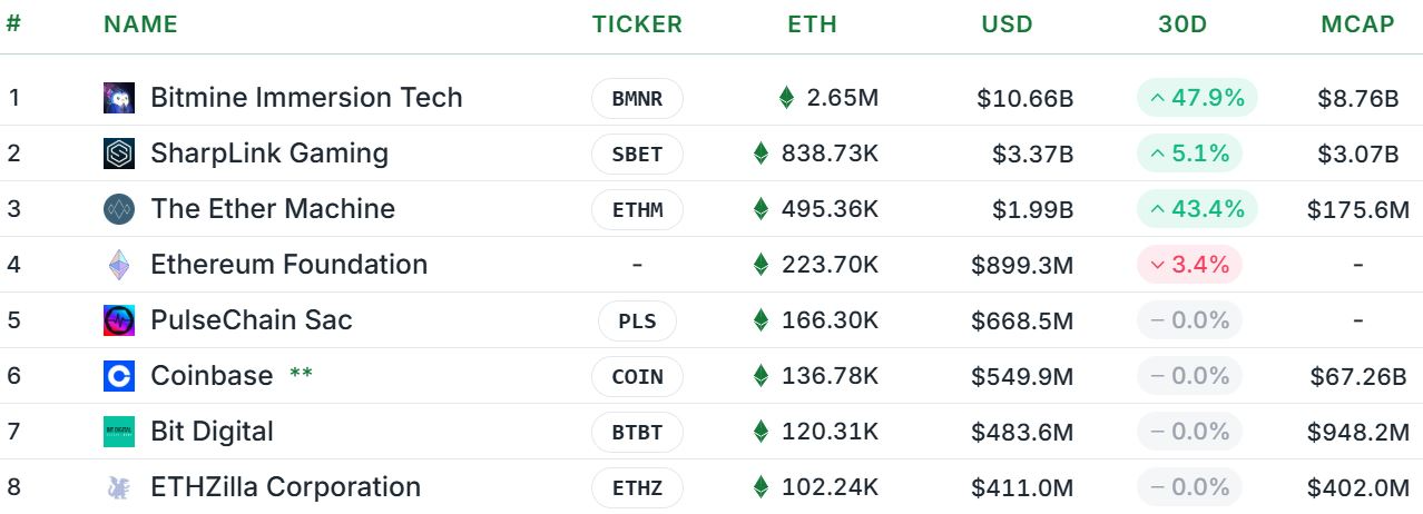 Bitmine Immersion Technologies является крупнейшей казначейской компанией Ether, с 2,65 миллионами токенов на сумму более 11 миллиардов долларов, и она поставила цель на 5% предложения токена.
