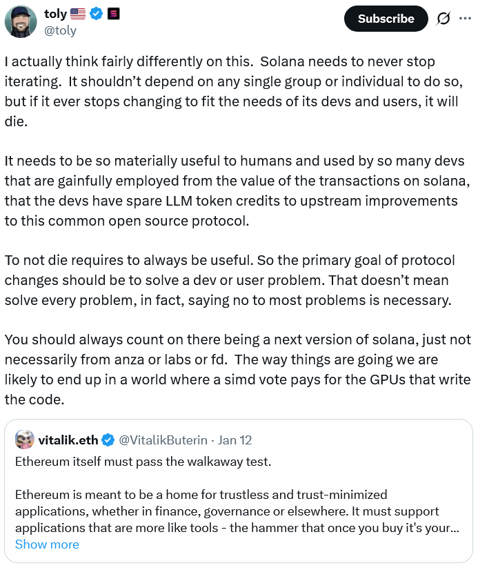 Бутерин хочет максимизировать децентрализацию, конфиденциальность и суверенитет в Ethereum — даже за счет массового внедрения — в то время как Яковенко хочет, чтобы Solana была развивающейся экосистемой, которая вводит новые функции для адаптации к потребностям реального мира.