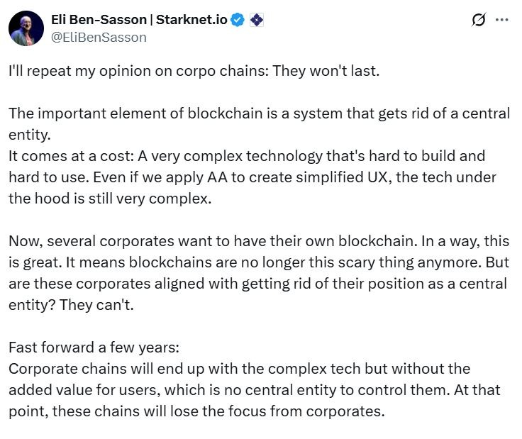 Бен-Сассон заявил в понедельник в сообщении для X, что он удваивает свое мнение о том, что «корпоративные» цепочки не просуществуют долго, потому что они не соответствуют фундаментальной концепции блокчейна, которая требует от них «избавиться от своей позиции центрального субъекта».