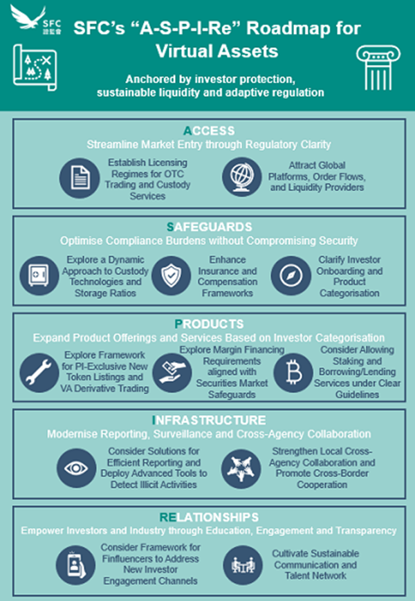 Столп «доступа» требует оптимизации рыночного выхода на рынок, «гарантия» посвящены улучшению соответствия без удушающего роста, а «продукты» фокусируются на расширении предложений виртуальных активов. SFC заявил:
