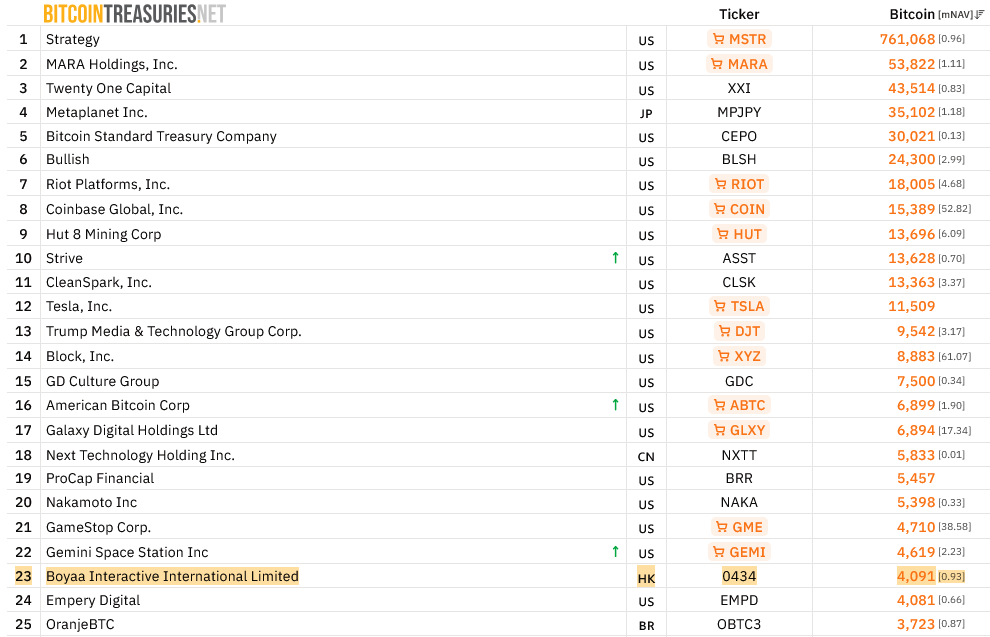 Boyaa, которая в период с августа по ноябрь совершила покупки Биткоин на сумму 80,5 миллионов долларов, в настоящее время является 23-м по величине корпоративным хранилищем Биткоин и третьим по величине в Азиатско-Тихоокеанском регионе, уступая только японской Metaplanet и китайской Next Technology Holding.