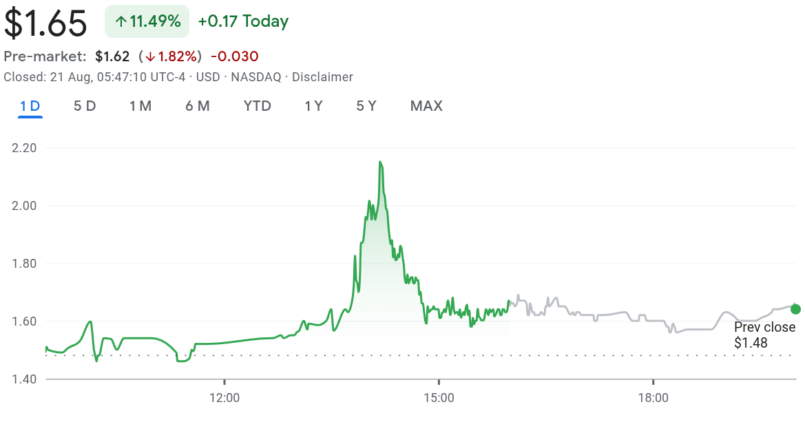 Первоначальное движение вверх по цене достигло 2,15 доллара в среду, но большая часть прибыли была потеряна в тот же день. Тем не менее, по текущей цене Ming Ching в 1,65 долл. США акции в четверг выросли почти на 11,5%.