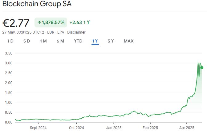 Группа блокчейна (ALTBG) перечислена на Euronext Paris, второй по величине фондовой бирже Европы на рыночной капитализации. На веб -сайте компании говорится, что она сосредоточена на «увеличении количества Биткоин на акцию с течением времени путем использования избыточных денежных средств холдинговой компании и соответствующих инструментов финансирования».