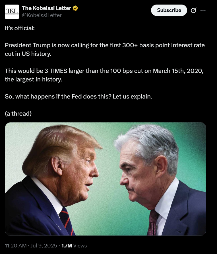 Повторные общественные вмешательства Трампа отмечают перерыв от многолетней нормы независимости центрального банка, в которой исполнительная власть воздерживается от вмешательства в решения денежно-кредитной политики. Он призвал к исторически значимому снижению ставок, чтобы сократить федеральные процентные выплаты и стимулировать экономический рост.