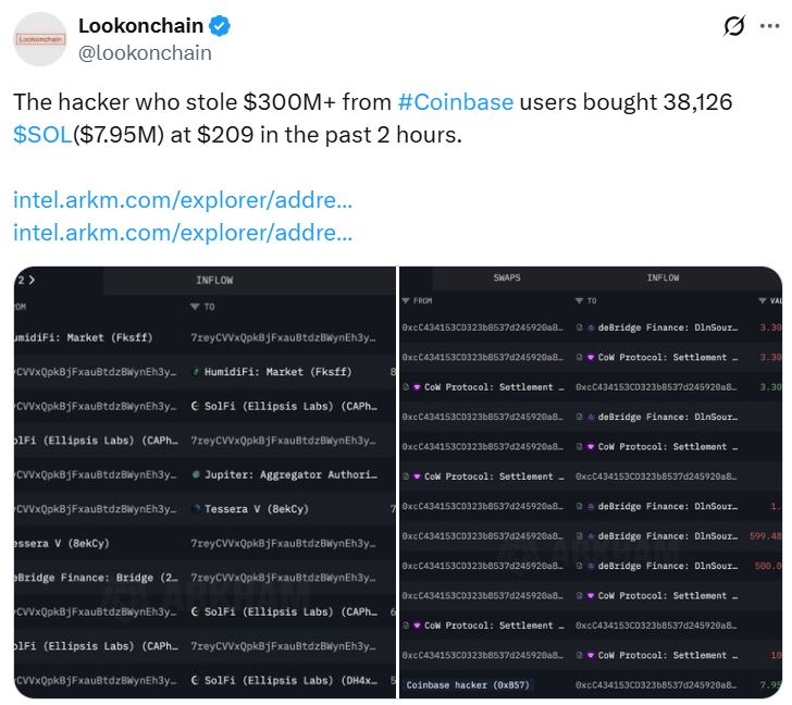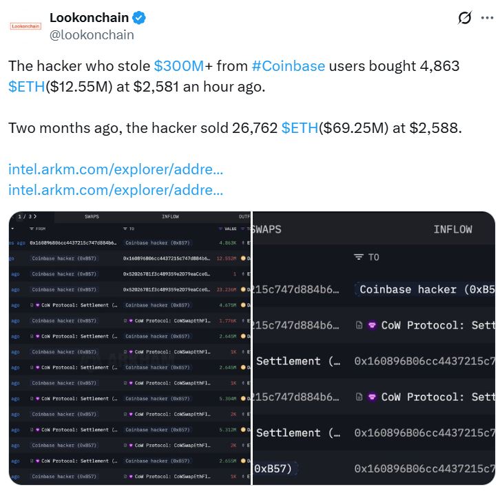 Аналитическая платформа блокчейна Arkham отметила адрес кошелька как «хакер Coinbase», в то время как Loutonchain утверждает, что кошелек связан с кражей более 300 миллионов долларов от пользователей Coinbase.