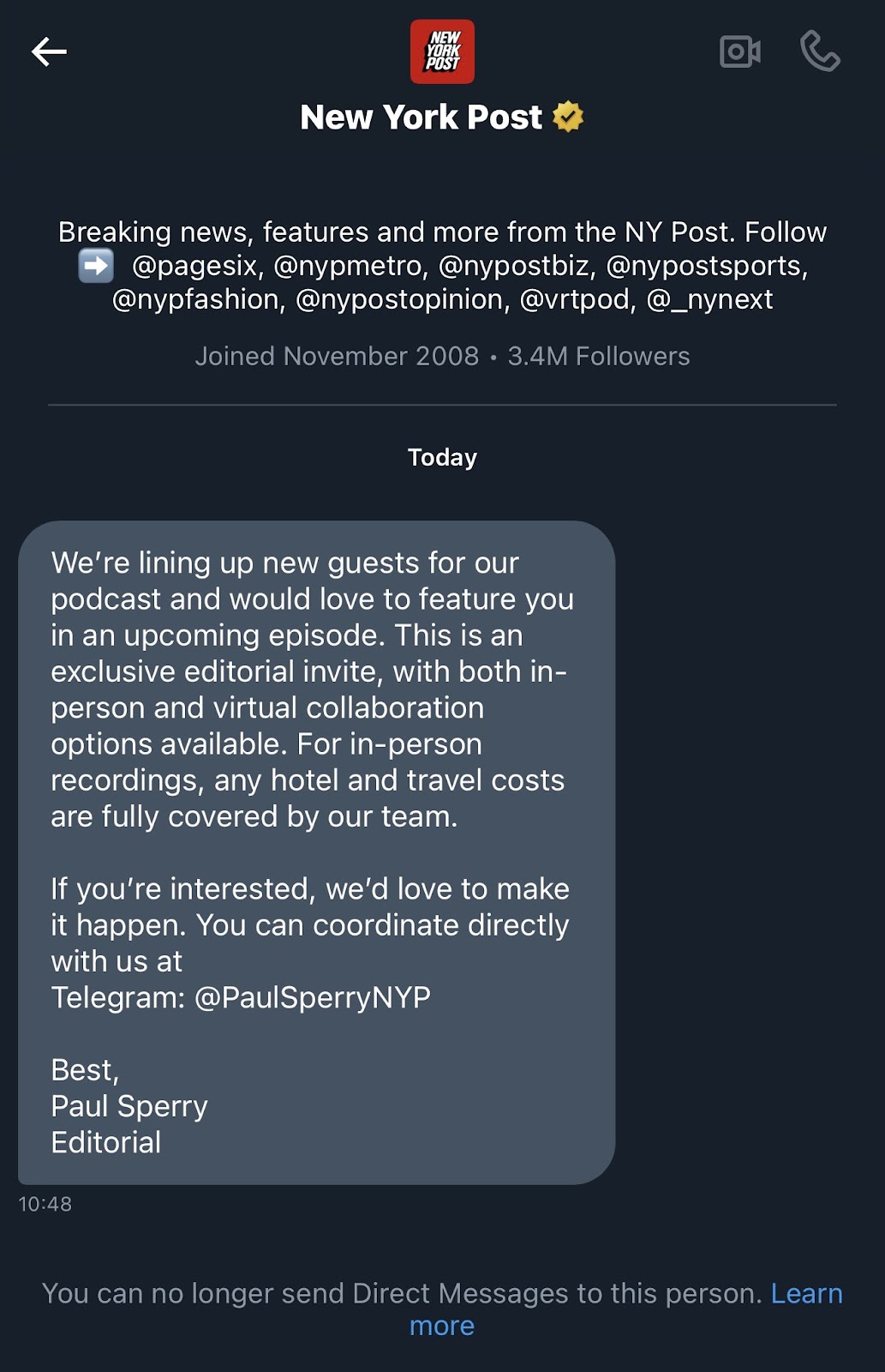 Некоторые пользователи X из сообщества криптовалют недавно сообщили, что получили личное сообщение от учетной записи X New York Post, приглашающей их участвовать в подкасте и связаться с ними через Telegram.