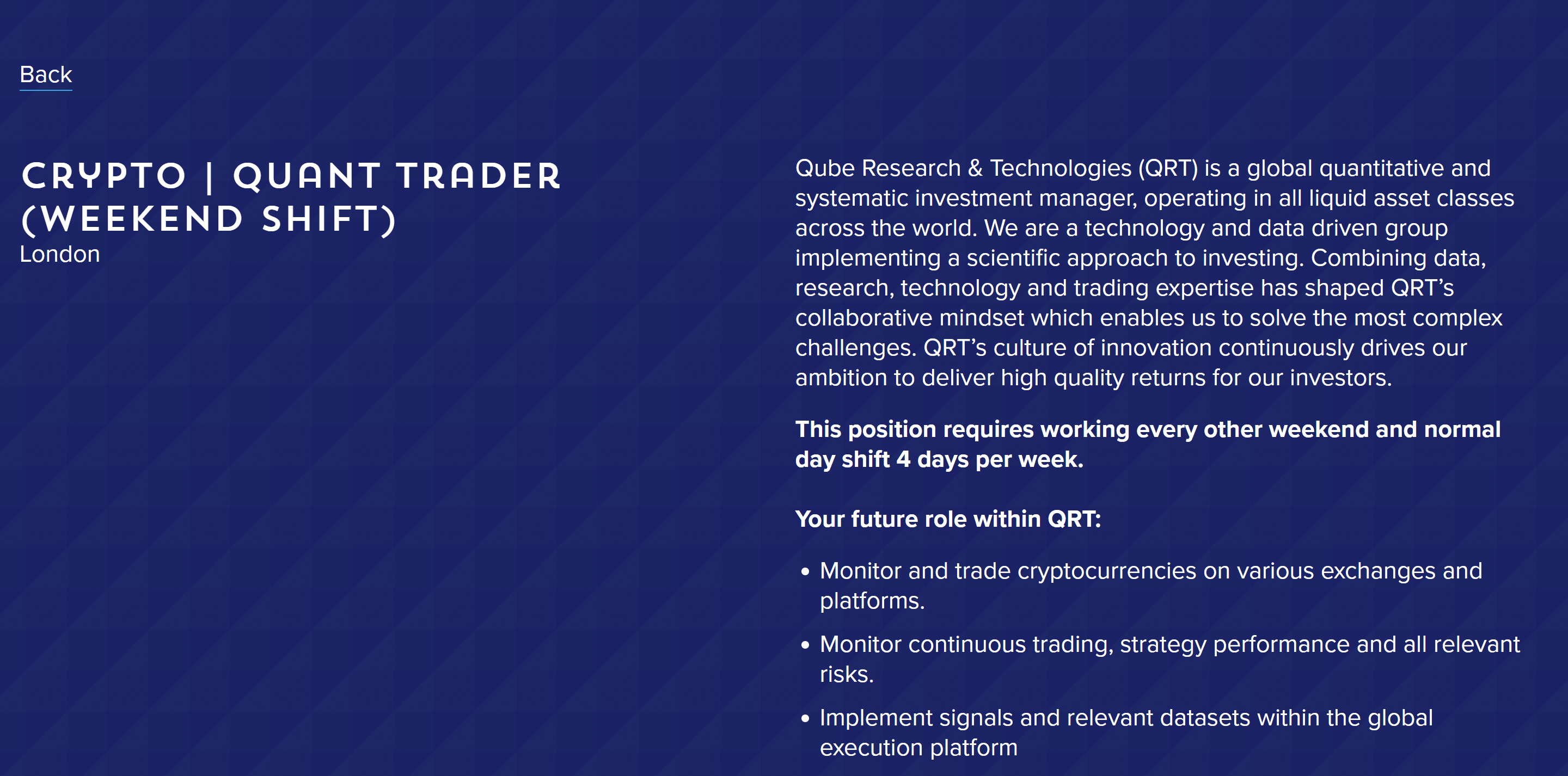 Qube Research & Technologies, глобальная количественная фирма по управлению инвестициями со штаб-квартирой в Лондоне, нанимает роль «криптовалюта | Quant Trader (Shift Weekend)» в Лондоне, которая требует доступности в выходные дни в дополнение к четырехдневной рабочей неделе.