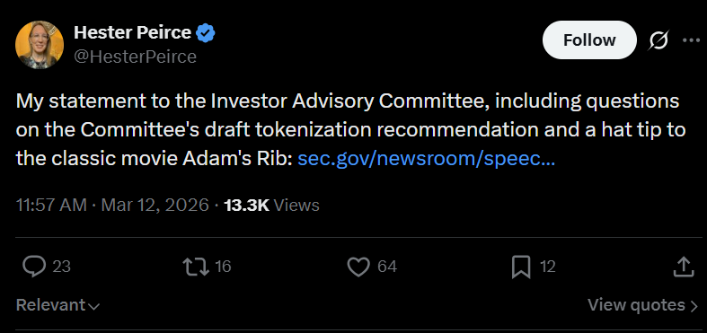 Комиссар Комиссии по ценным бумагам и биржам США (SEC) Хестер Пирс заявила, что регулирующим органам следует избегать микроуправления рынками и рассмотреть возможность упрощения требований к раскрытию информации, поскольку дискуссии вокруг токенизированных ценных бумаг продолжаются.