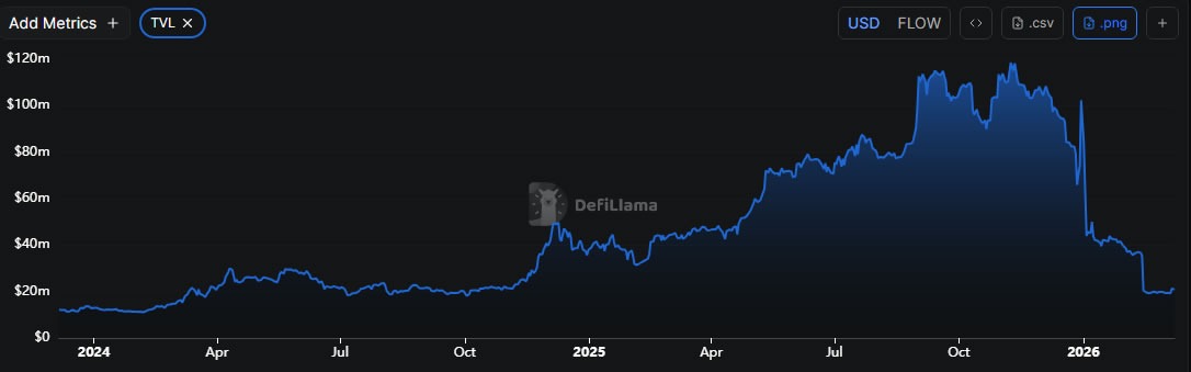 По данным CoinGecko, FLOW упал на 99,9% по сравнению с историческим максимумом 2021 года, когда он достиг 42 долларов. Общая стоимость, заблокированная на платформе, снизилась на 82% до $21 млн с пика в ноябре 2025 года, сообщает DeFiLlama.