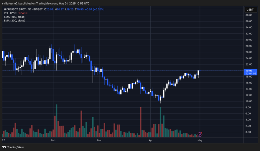 Hype продолжает утверждать себя как один из ведущих проектов DEFI в текущем рыночном цикле, выступая в качестве основного децентрализованного обмена (DEX) с растущей активностью пользователя и ликвидностью. После сильного завода в течение последних нескольких недель, токен теперь приближается к критическому этапу, поскольку быки пытаются восстановить максимум диапазона и продвигать психологический уровень сопротивления в размере 20 долларов США.
