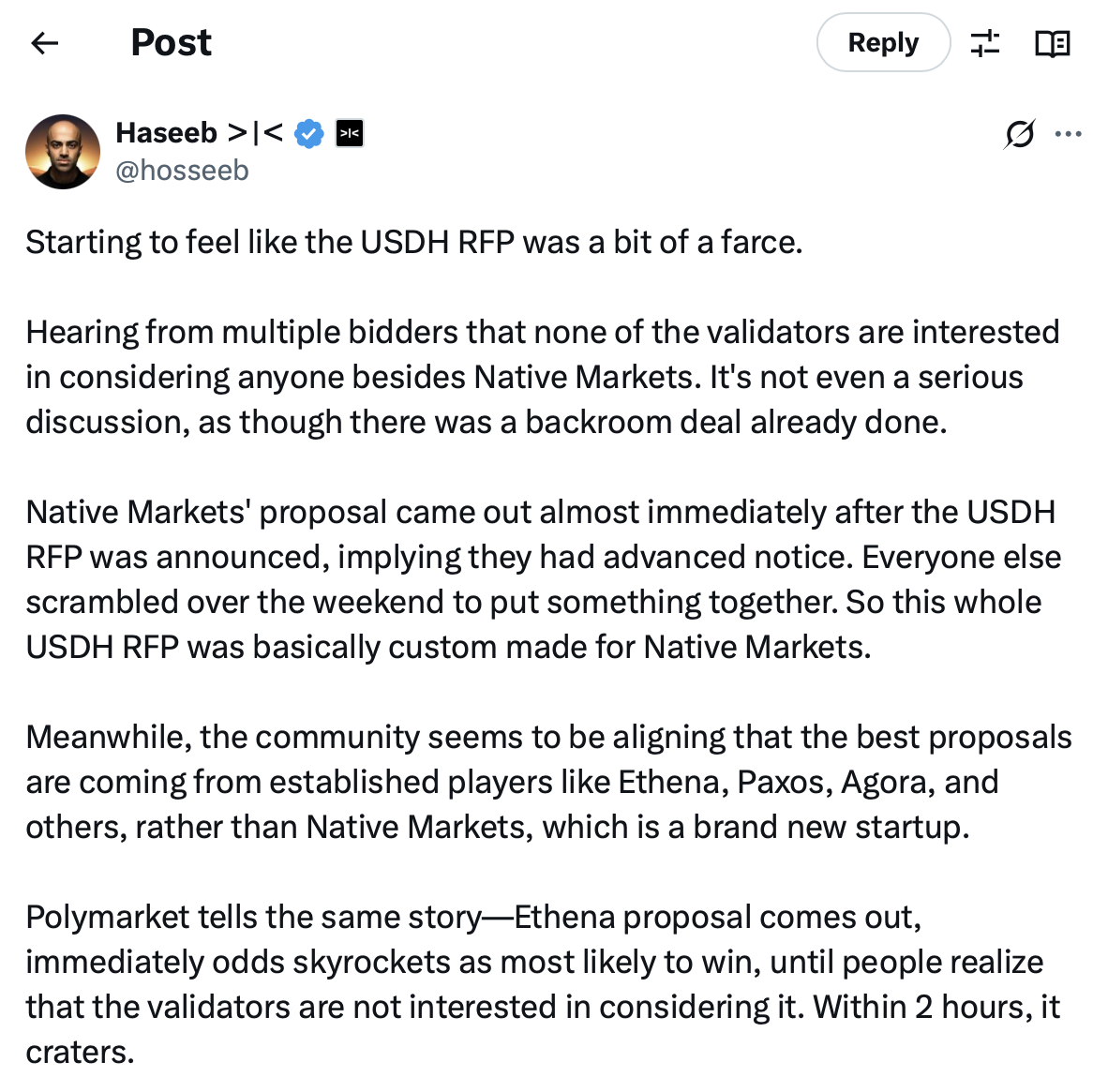 9 сентября Куреши писал на X, что он слышал от «многочисленных участников торгов, что ни один из валидаторов не заинтересован в рассмотрении кого -либо, кроме местных рынков», и что тот факт, что предложение от стартапа криптовалюты вышло сразу после объявления о запросе USDH о предложении, предполагает «у них было расширенное уведомление».