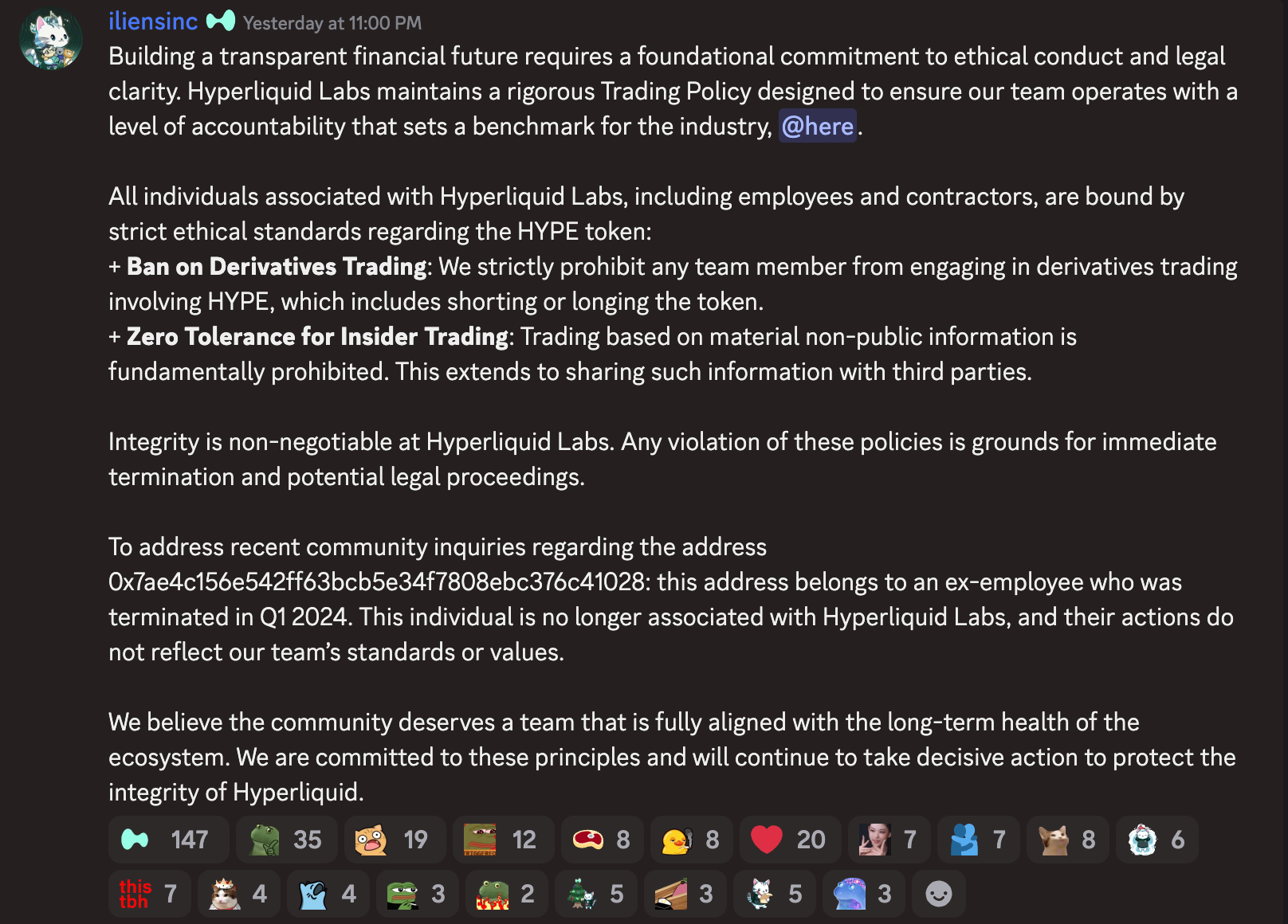 В сообщении Discord Илиенсинк заявил, что Hyperliquid Labs придерживается строгой торговой политики, призванной гарантировать, что ее команда работает с «уровнем подотчетности, который устанавливает эталон для отрасли».