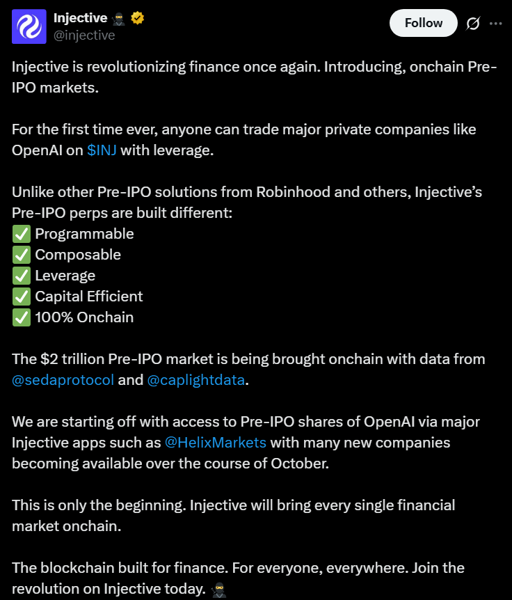 Протокол инъективного блокчейна Layer-1, сфокусированный на децентрализованных финансах, запускает вечные рынки Onchain Pre-IPO, предоставляя глобальным инвесторам доступ к торговым синтетическим версиям крупных частных компаний, таких как OpenAI.