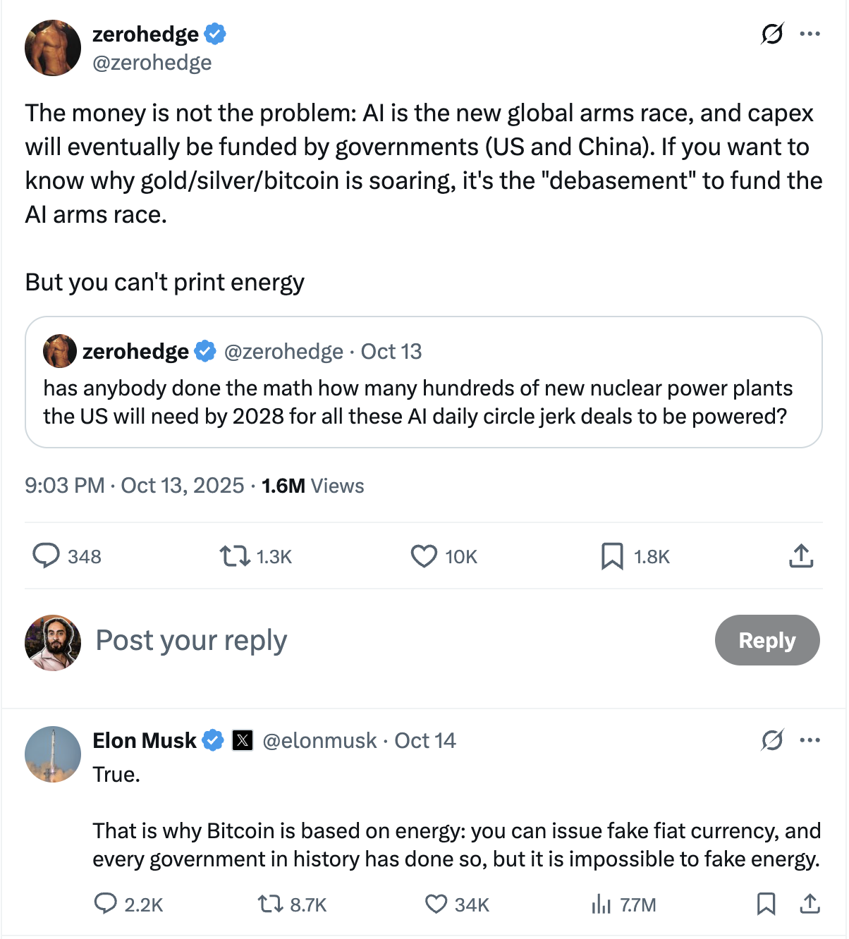 В сообщении на X Маск подчеркнул энергоемкую систему доказательства работы Биткоина, назвав ее «невозможно подделать энергию» — в отличие, по его предположению, от выпущенных государством валют.