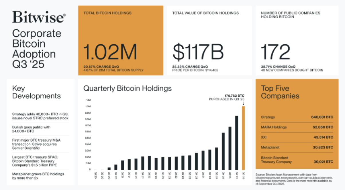 В своем отчете о корпоративном внедрении Биткоин за третий квартал компания Bitwise обнаружила, что 172 компании в настоящее время держат биткоин на своих балансах, причем 48 из них появились только в третьем квартале.