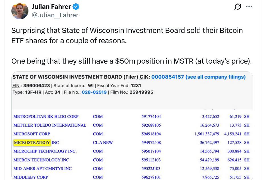 Инвестиционный совет штата Висконсин (SWIB), который курирует пенсионные фонды штата, в первом квартале выгрузил свои акции в BlackRock Ishares Bitcoin Trust ETF (IBIT).